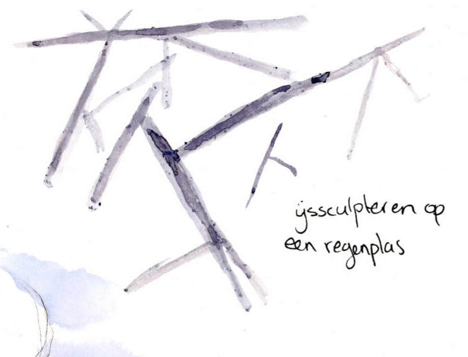 Wil je buiten werken met waterverf als het vriest, houd er dan rekening mee dat je verf kan bevriezen en daardoor slechter (en op een gegeven moment helemaal niet meer) vloeit. Je zult ook ijsstructuren in je verf en op papier gaan zien. Als je goed kijkt kan je dat zien in de onderstaande ijstekening. Het zijn de donkerdere stipjes waar mijn verf kristalliseerde.
