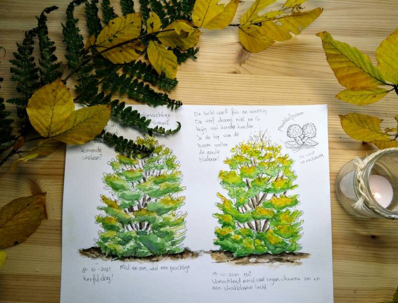 Terwijl ik zit te schilderen vliegt er een groep ganzen hoog over het bos, hun groep heeft iets weemoedigs. Mijn tekening is nog helemaal vochtig als ik klaar ben en kan niet in mijn tas. Een wandelaar kijkt me verwonderd aan. Onderweg naar huis kom ik laaghangende beukentakken tegen met mooie gele bladeren en een groen varenblad. Ik neem ze mee naar huis, daar mogen ze op mijn seizoenstafel staan.