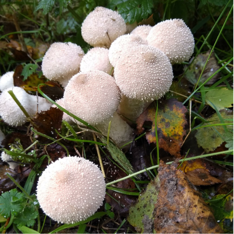 Onderweg door het bos kom ik groepjes parelstuifzwammen tegen. Ik sta even stil om ze beter te bekijken en te schetsen, ik verbaas me over de bijzondere vorm en structuur van deze paddenstoelen.