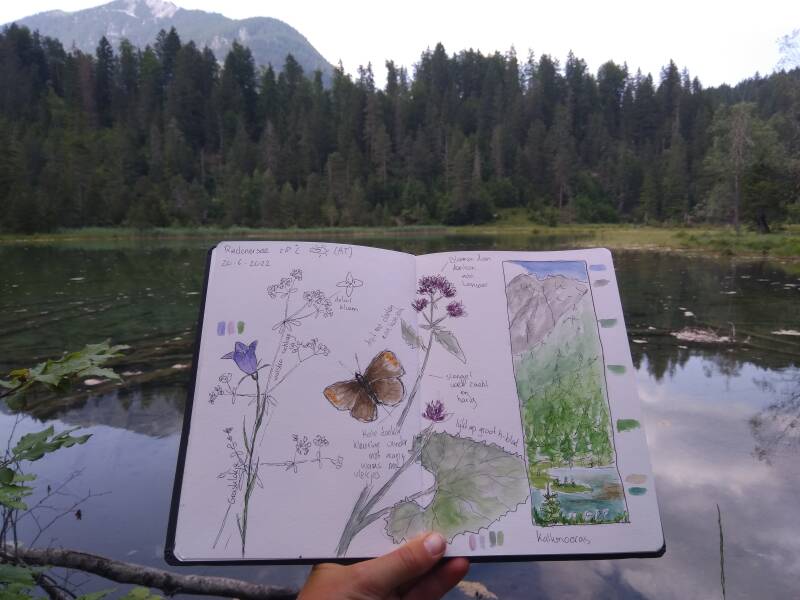 De journalpagina helemaal bovenaan deze blog is gemaakt aan de Riedenersee, een dag later. Dit is een hele bijzondere plek met een uniek ecosysteem. Het is een kalkmoeras. Het water van het meer heeft op sommige plaatsen een turquoise kleur. Op die plekken zijn bronnen in de bodem van het meer waar kalkrijk water naar boven komt.